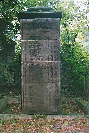 Standort: Unmittelbar hinter dem Obelisk Dieses Denkmal auf dem sowjetischen Friedhof wurde im Auftrag der Vereinten Nationen 1946 errichtet. Es ist die namentliche Erinnerung an 268 Zwangsarbeiter und Kriegsgefangene, die in Chemnitzer Betrieben und in Betrieben des Umlandes von Chemnitz arbeiten mussten und an den Folgen von Misshandlungen, durch Hunger und an Krankheiten starben Es wird auch ermordeter Chemnitzer Antifaschisten gedacht.