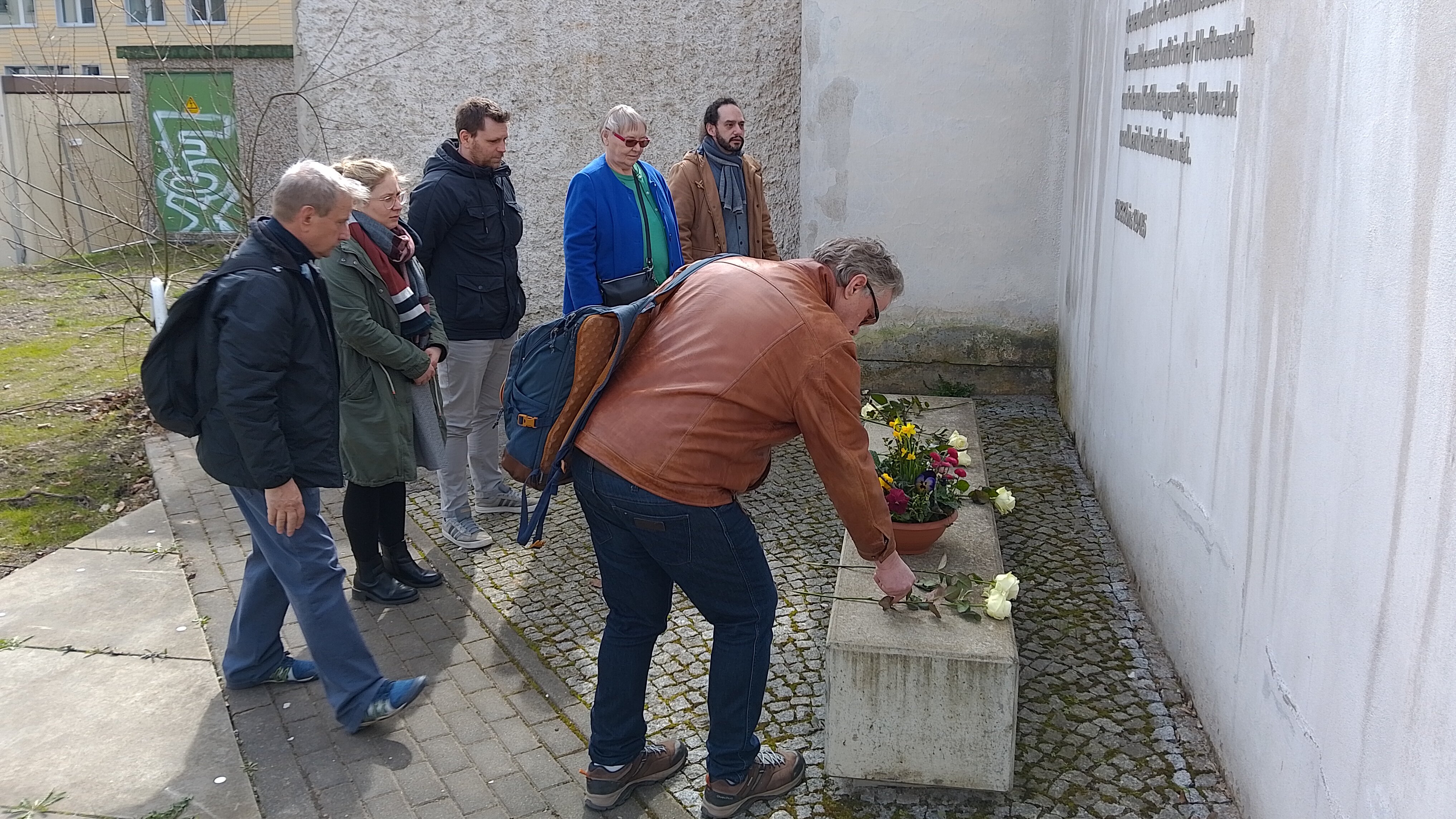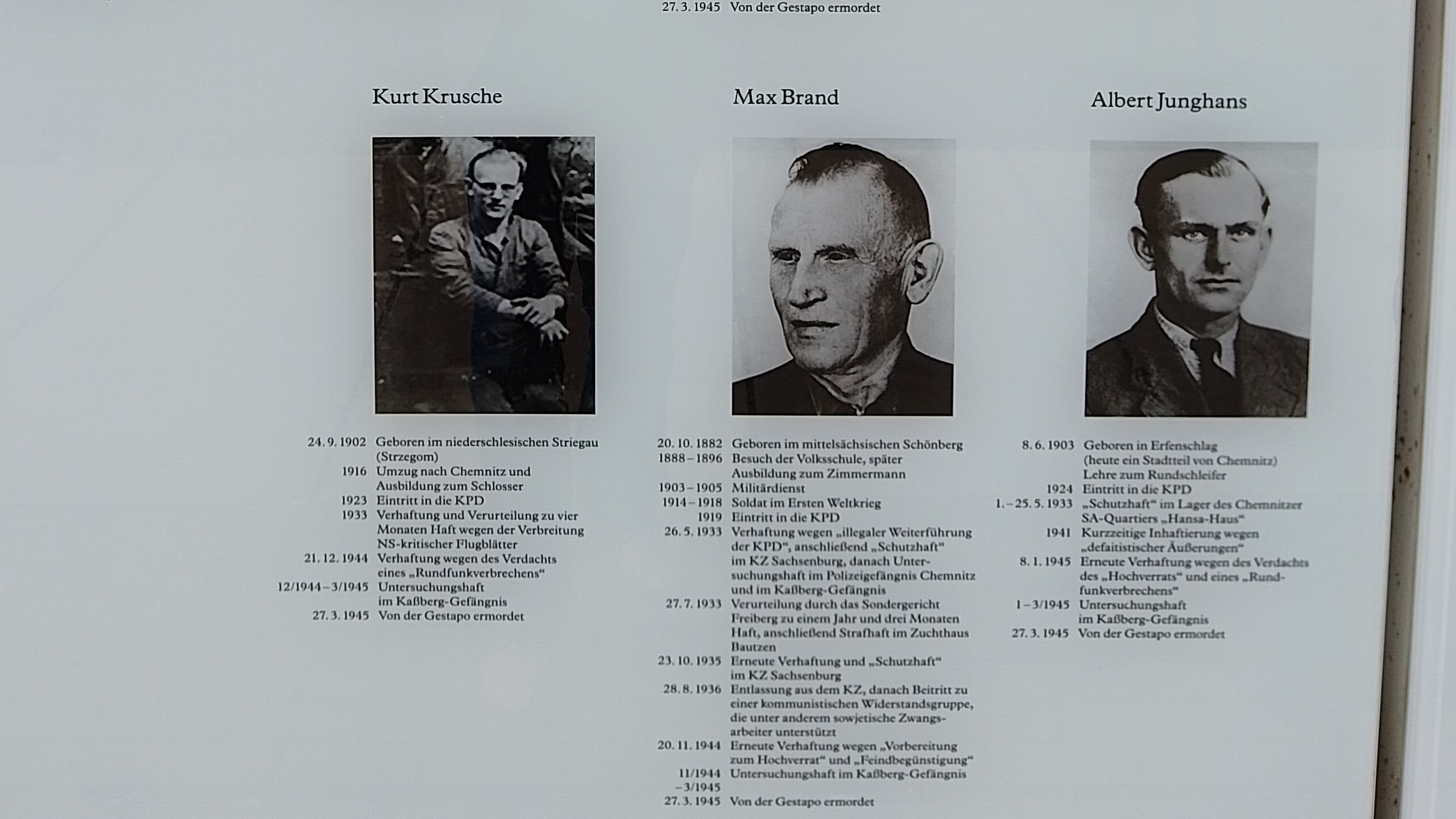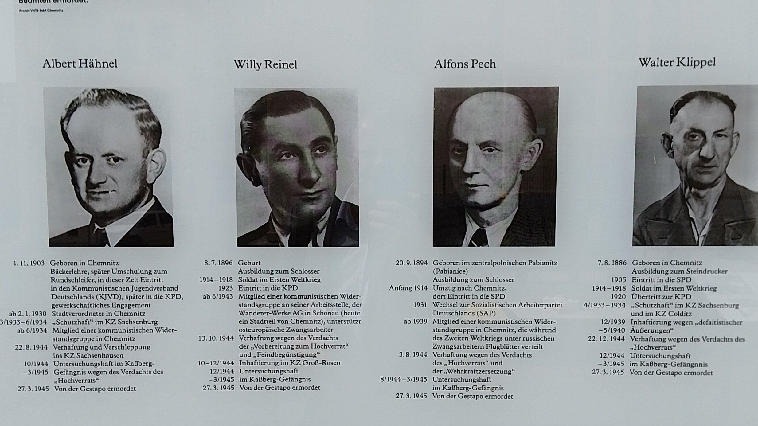 Hutholz, einem Waldstück am Stadtrand von Chemnitz, als “rückfällige” politische Gefangene von Gestapo-Beamten ermordet.