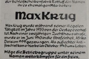 Ehrenname der SED-Parteigruppe im VEB Schleifscheibenfabrik Rottluff/Karl-Marx-Stadt POS "Max Krug" Karl-Marx-Stadt (bis 1991), Jugendweg 1a Max-Krug-Straße wurde nach 1990 in Achatstraße umbenannt Quellen/Literatur Broschüre "Aus der Vergangenheit lernen, die Gegenwart meistern, die Zukunft gestalten", Rat der Stadt Karl-Marx-Stadt, Abt. Kultur Broschüre "Gegen das Vergessen", VVN-BdA Stadtverband Chemnitz Sächsisches Staatsarchiv Stadt Chemnitz, Stadtarchiv