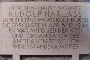 Rudolf Harlaß wird für seinen antifaschistischen Kampf in der Gedenkstätte der Sozialisten in Berlin und im städtischen "Ehrenhain der Sozialisten" in Chemnitz gedacht.